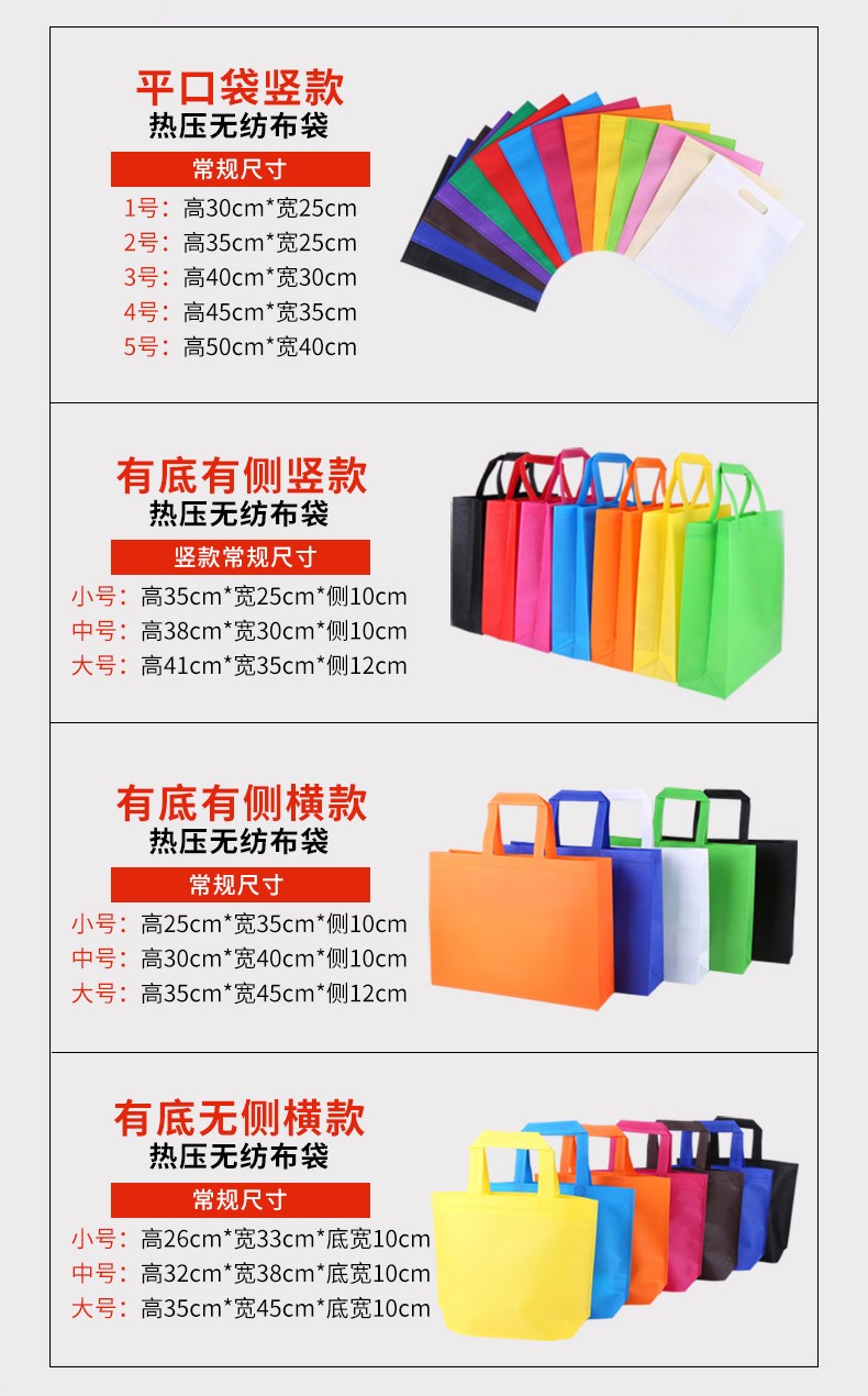 以下為我們在市面上常見的無紡布袋規格,我們雖然定制,可以隨意定制規格尺寸,為什么還要列出常用規格呢?因為常用規格實惠,加工生產時浪費少,那么對于顧客來講,實用加實惠,大家可以以此為參考。